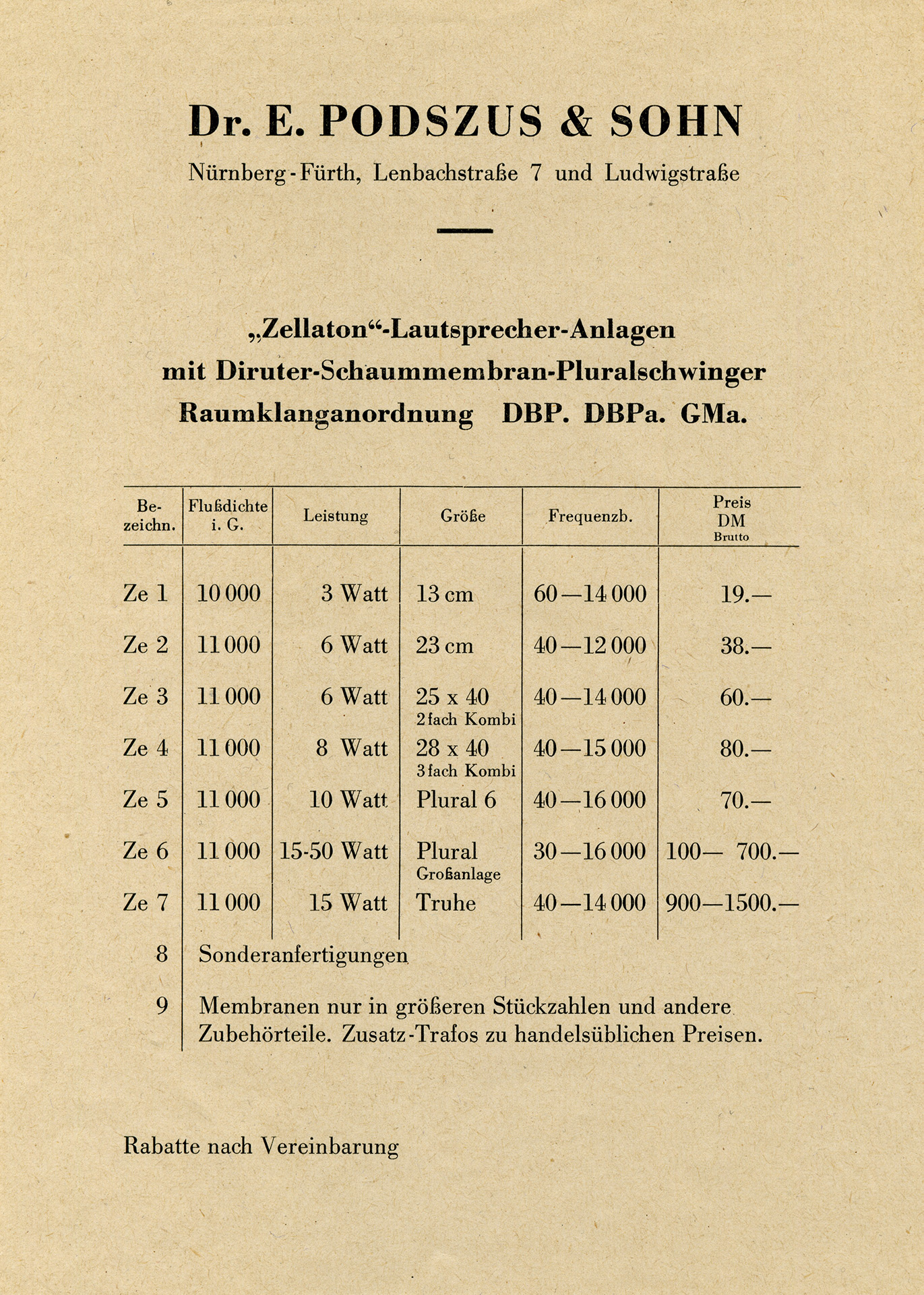Von Beginn an war es sein Ziel einen Volkslautsprecher zu bauen, damit jeder in den Genuss hochwertiger Musikwiedergabe käme. Aber der Aufwand hatte natürlich seinen Preis, so dass es nicht wirklich zum Überleben reichte. Dennoch begeisterten er und sein Sohn Kurt mit diesen Ausnahme-Schallwandlern - die ihrer Zeit weit voraus waren - viele Privat- und auch Industriekunden, wie z. B. den Studio-Ausrüster Klein + Hummel. So wurde die Ära der highfidelen Lautsprecher eingeleitet - durch Zellaton - handmade by Dr. Emil Podszus und Sohn. In diese Linie reiht sich nun der Enkel, der Tradition verpflichtet - Lautsprecher zu bauen, die ihrer Zeit voraus sind.