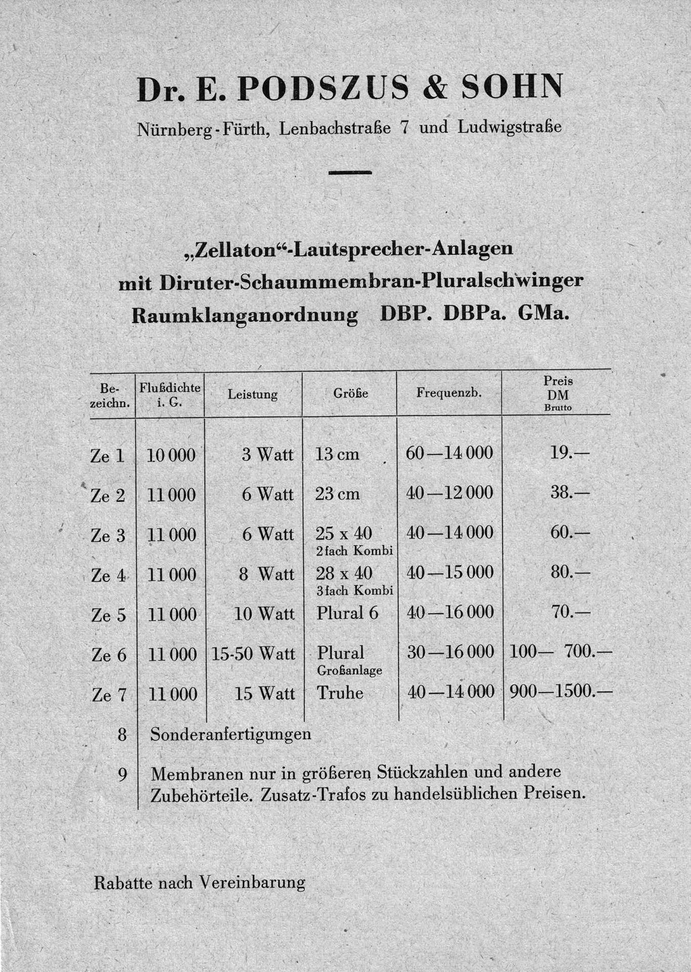 Seine Podszus-Zellaton Lautsprecher fanden eine so große Beachtung, dass die Direktoren der Firma Siemens seine Produktionsstätte besuchten. Sie waren fassungslos, als sie diesen "Ofen" im Keller sahen. Sie wollten eine Serie mit 10.000 Apparaten bestücken. Das wäre in Ostdeutschland technisch nicht möglich gewesen, von der Materialbeschaffung ganz abzusehen. Auf den Hinweis eines Geheimpolizisten, er würde verhaftet werden, flüchtete er in den Westen und musste neu beginnen. Er nahm jetzt zum Backen einen "normalen Herd". Sein Sohn und eine Hilfskraft, Hr. Görlich, standen ihm zur Seite. Der Vertrieb lief sehr gut. Die Presse und viele Kritiker sprachen von einer noch nie da gewesenen Klangreinheit. Die verzerrenden Eigenschwingungen der üblichen Membranen fehlten.