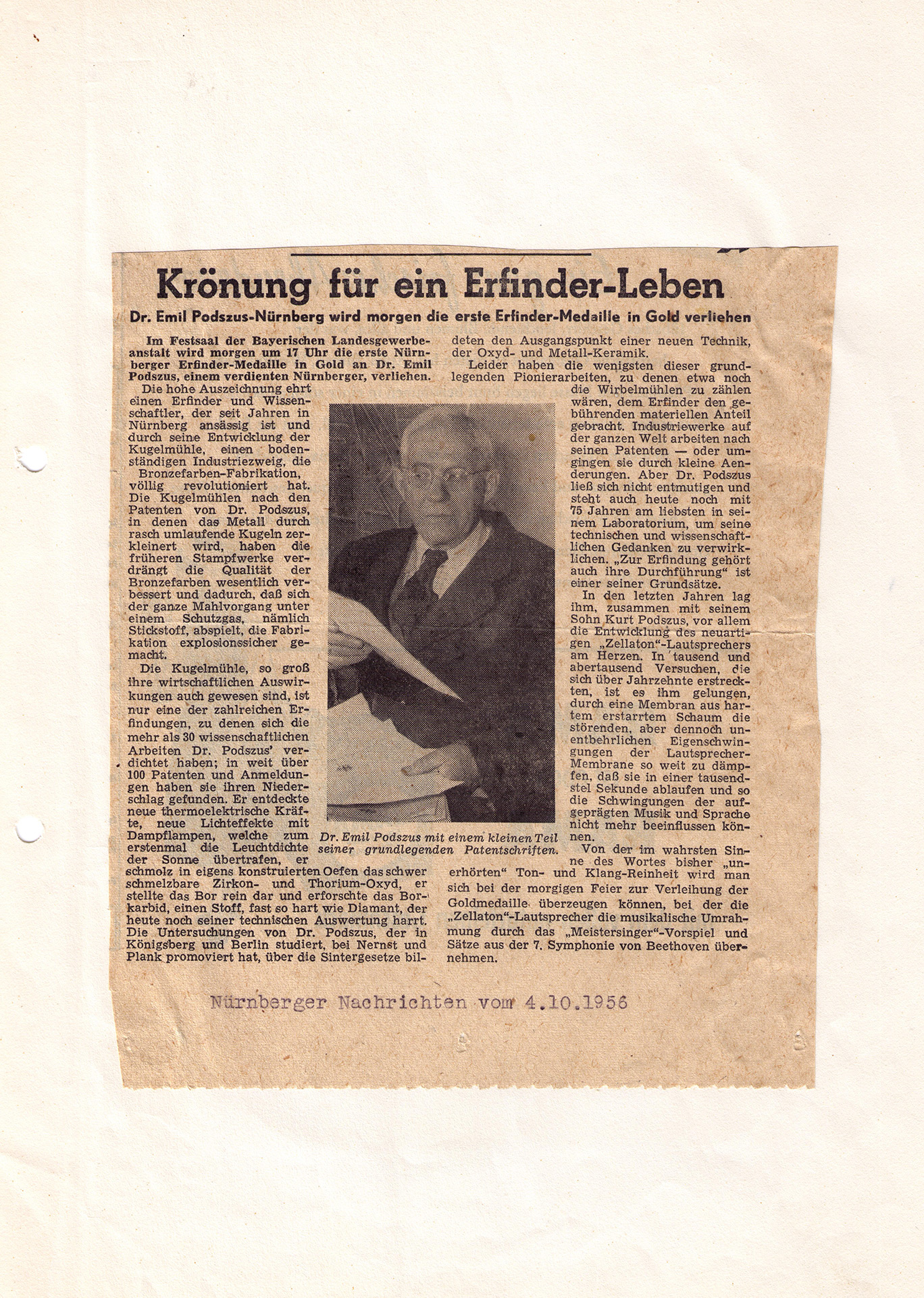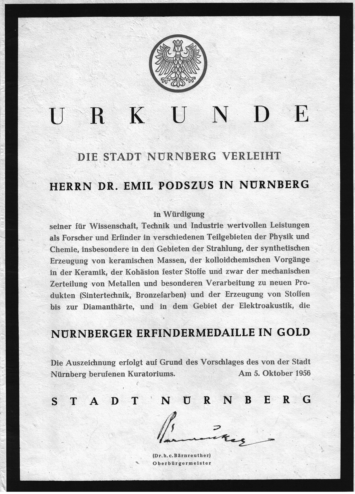 Dr. Emil Podszus erhielt für seine Verdienste die erste große goldene Erfindermedaille der Stadt Nürnberg. Für den Akt der Verleihung wollte man vor erlesenem Publikum das bayerische Symphonieorchester spielen lassen.